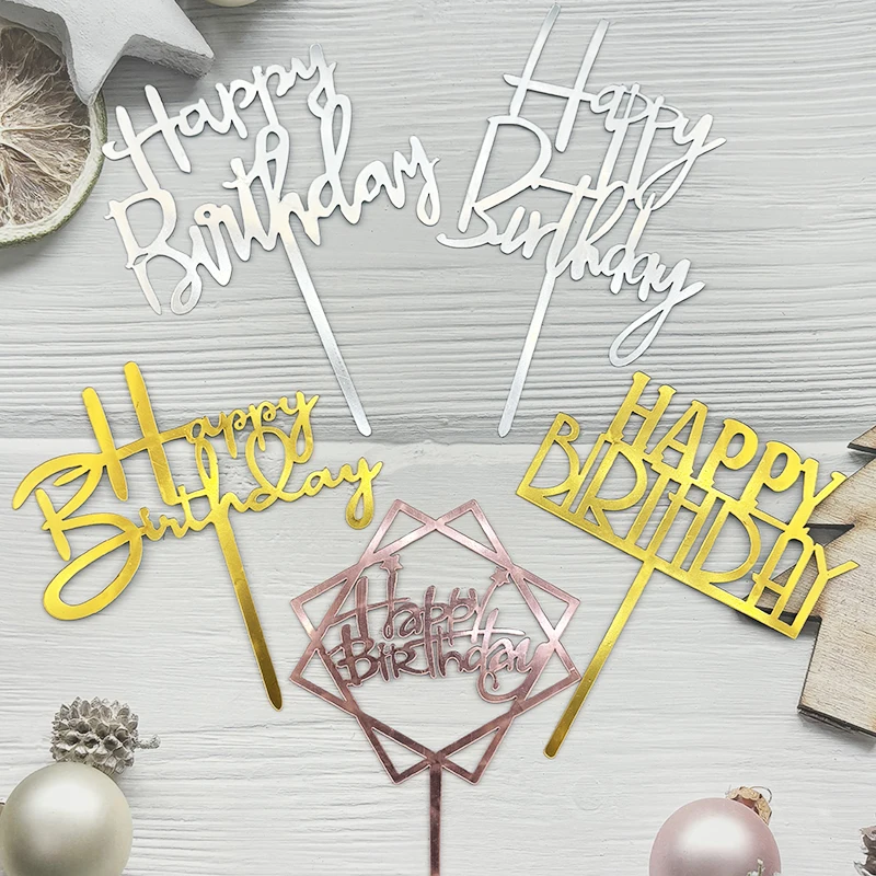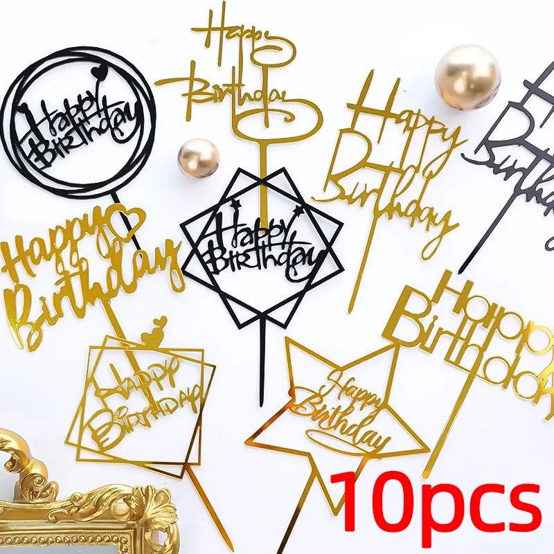 10 pçs acrílico feliz aniversário bolo topper preto ouro prata projetos decorações de bolo para crianças, homens, mulheres e chá de bebê - TopDealBox