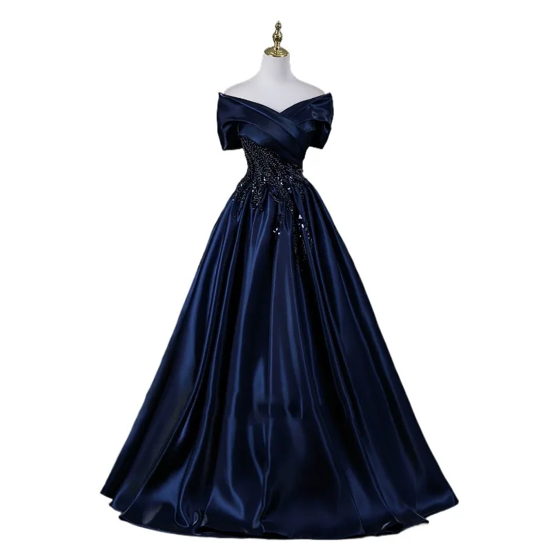 2026 novo vestido de noite de cetim feminino um ombro elegante emagrecimento retro frisado decoração desempenho vestido de exame de arte vocal - TopDealBox