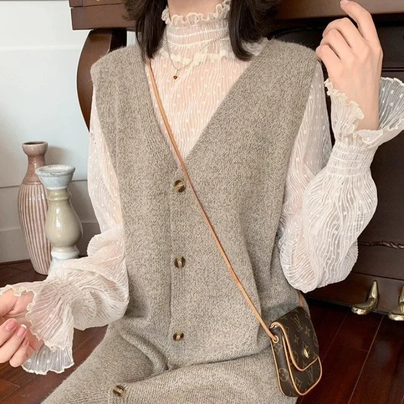 Blusa Feminina Bella Philosophy de Gola Alta em Renda Transparente Fina de Verão com Manga Longa Evasê - TopDealBox