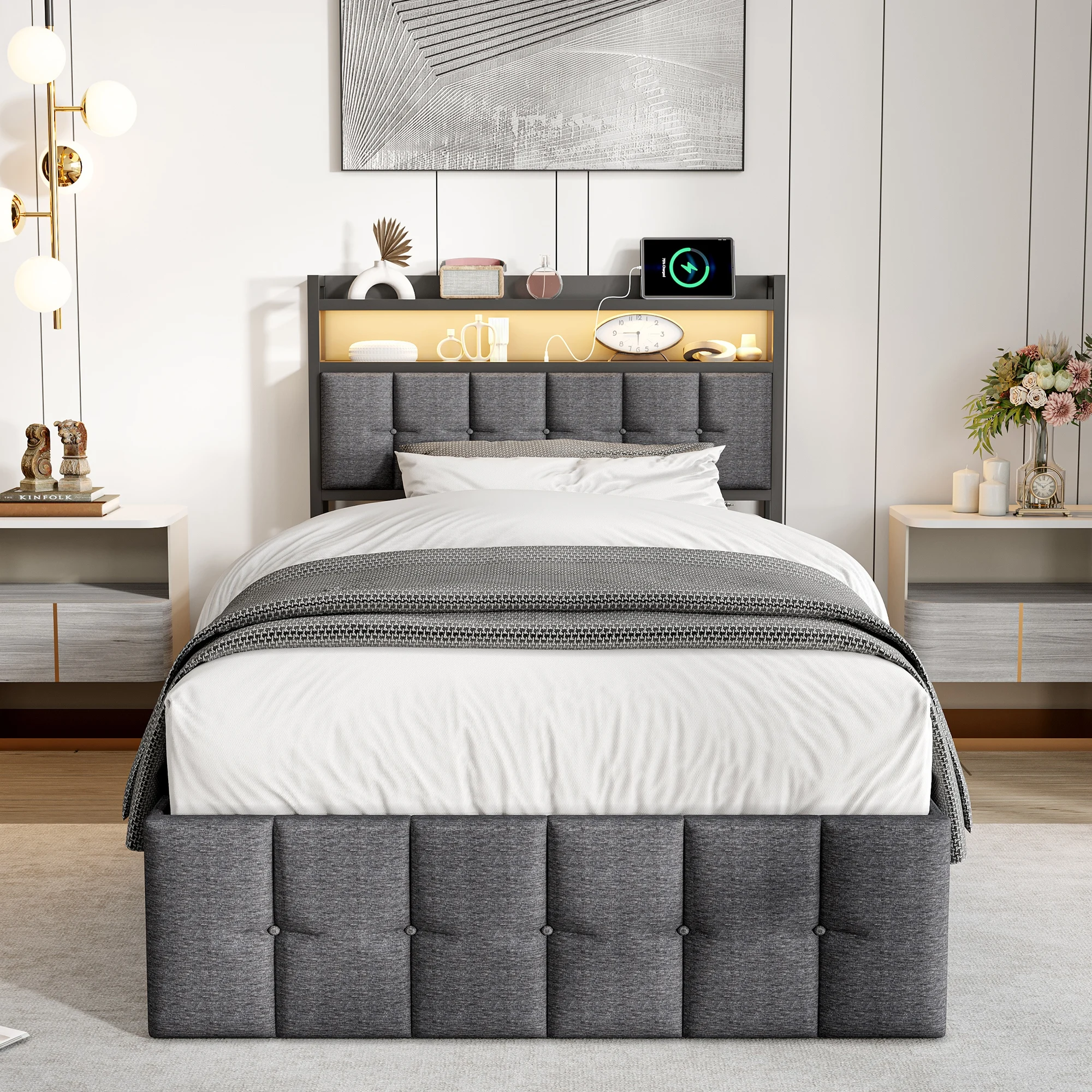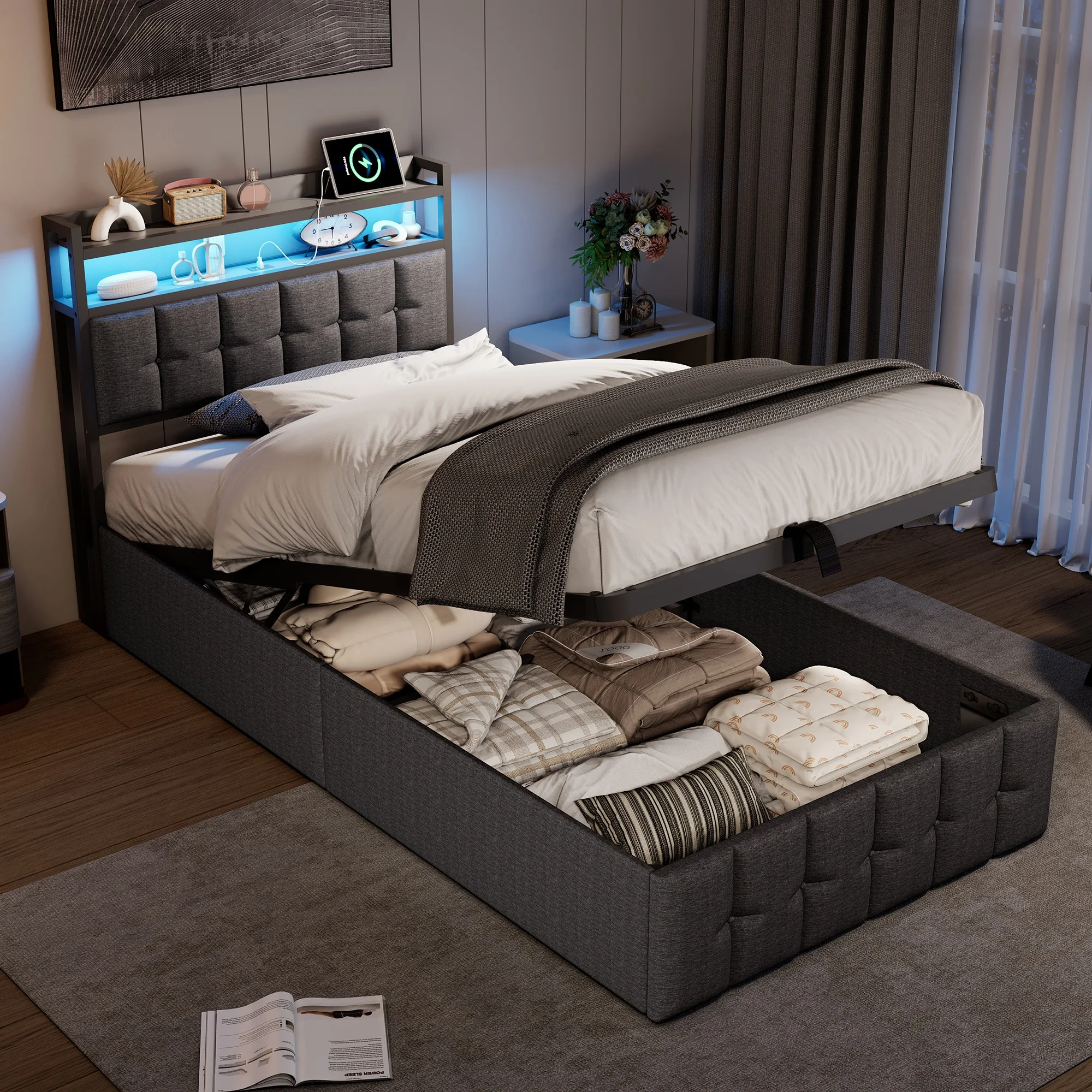 Cama estofada Rosahqnda, 90x200cm, com LED e USB, espaço de armazenamento aberto/fechado, cama de solteiro, estrutura de ripas, tecido de veludo/linho - TopDealBox