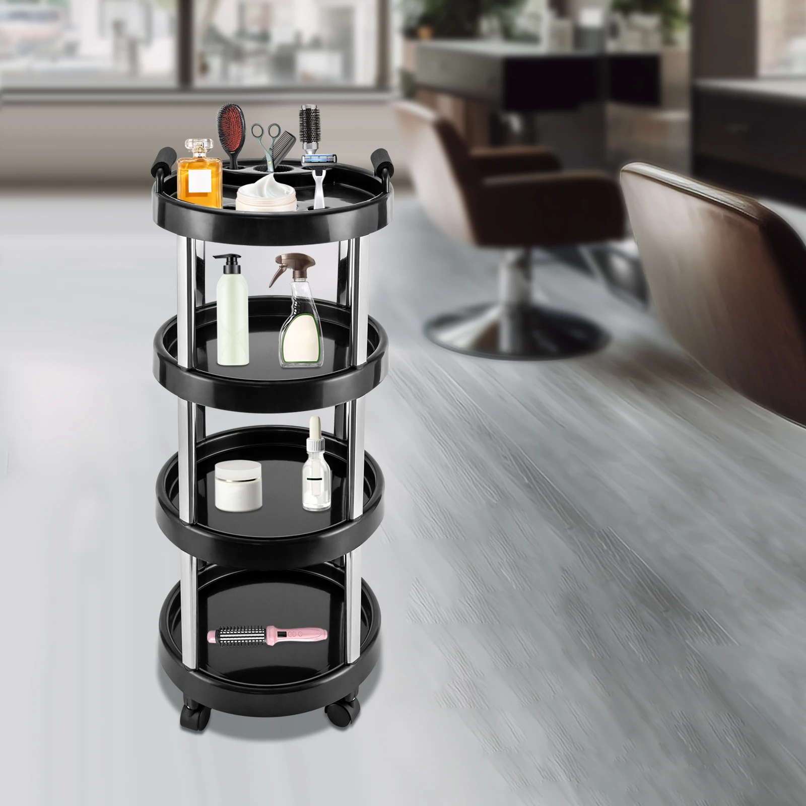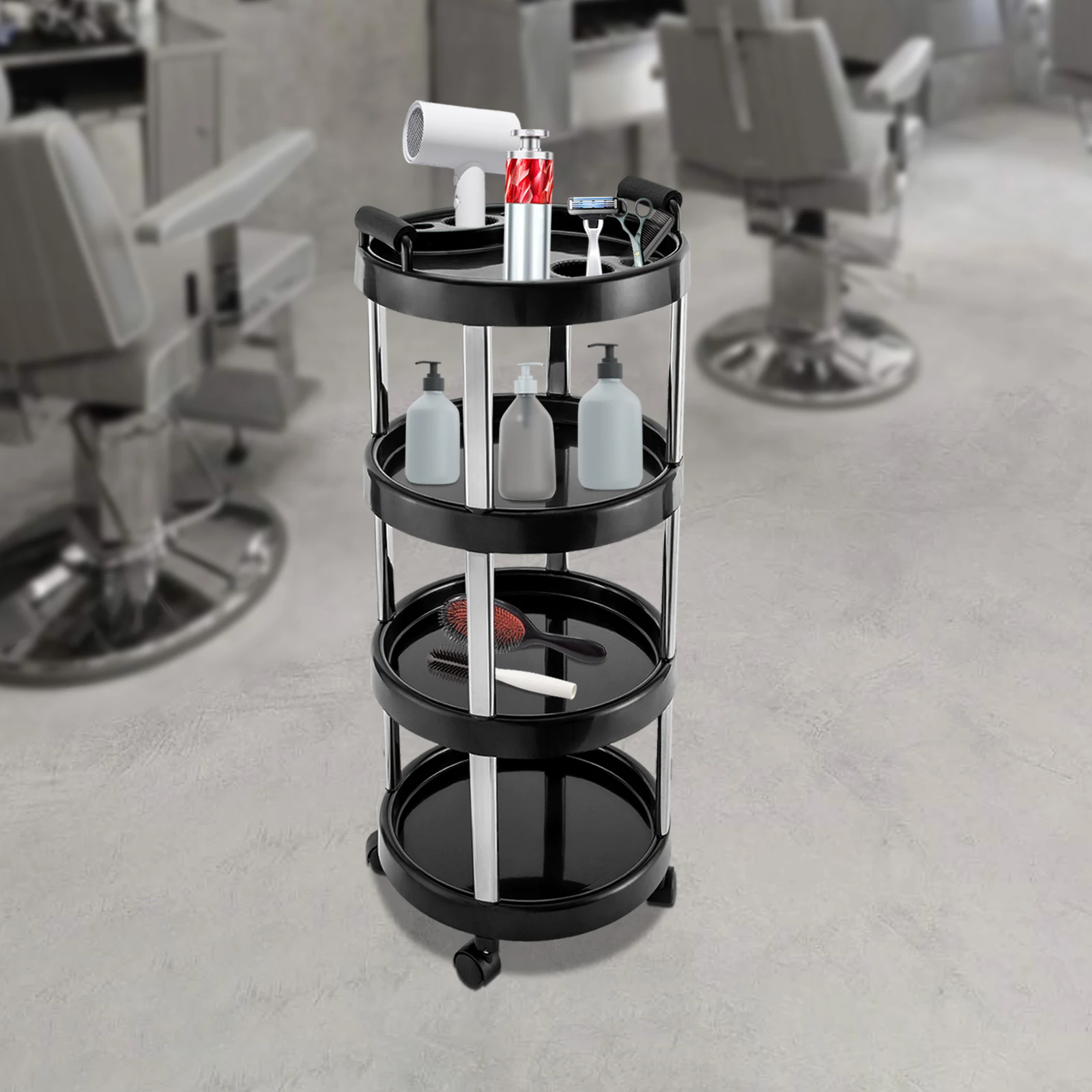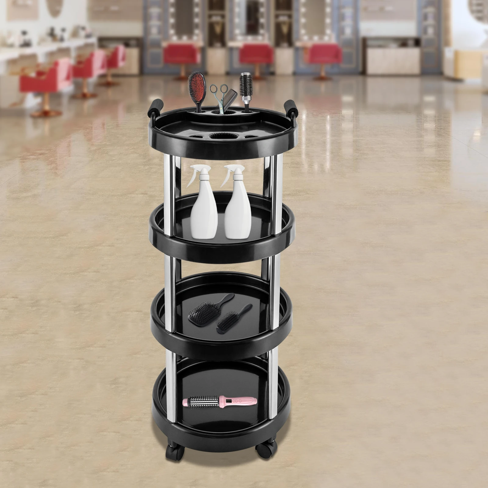 Carrinho de cabeleireiro redondo de 4 camadas, barbeiro, carro profissional, carrinho de cabeleireiro, cosméticos, oscilante, salão de beleza - TopDealBox