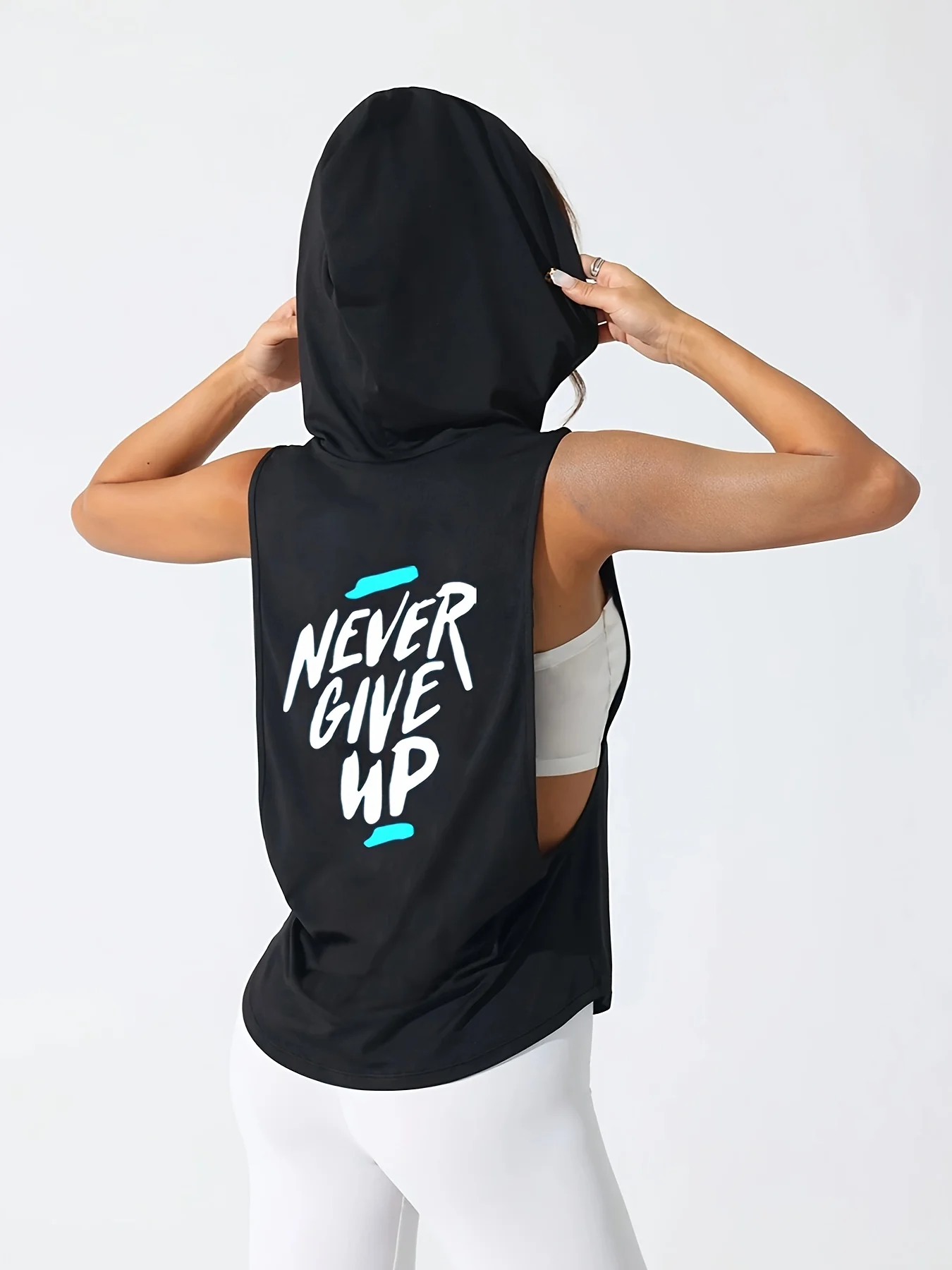 Colete esportivo feminino respirável de secagem rápida – Design com capuz e ajuste emagrecedor com gola estampada nas costas "Never Give Up" para academia de verão - TopDealBox