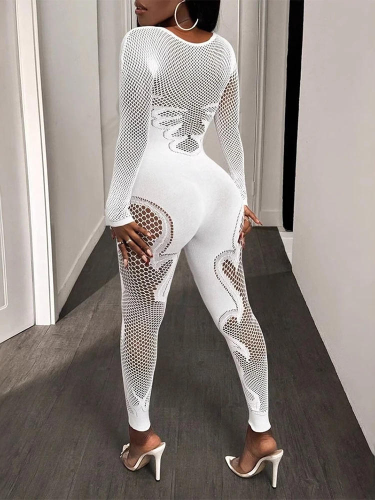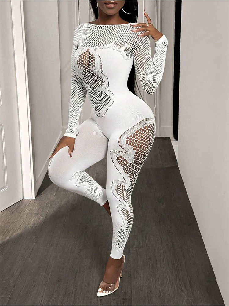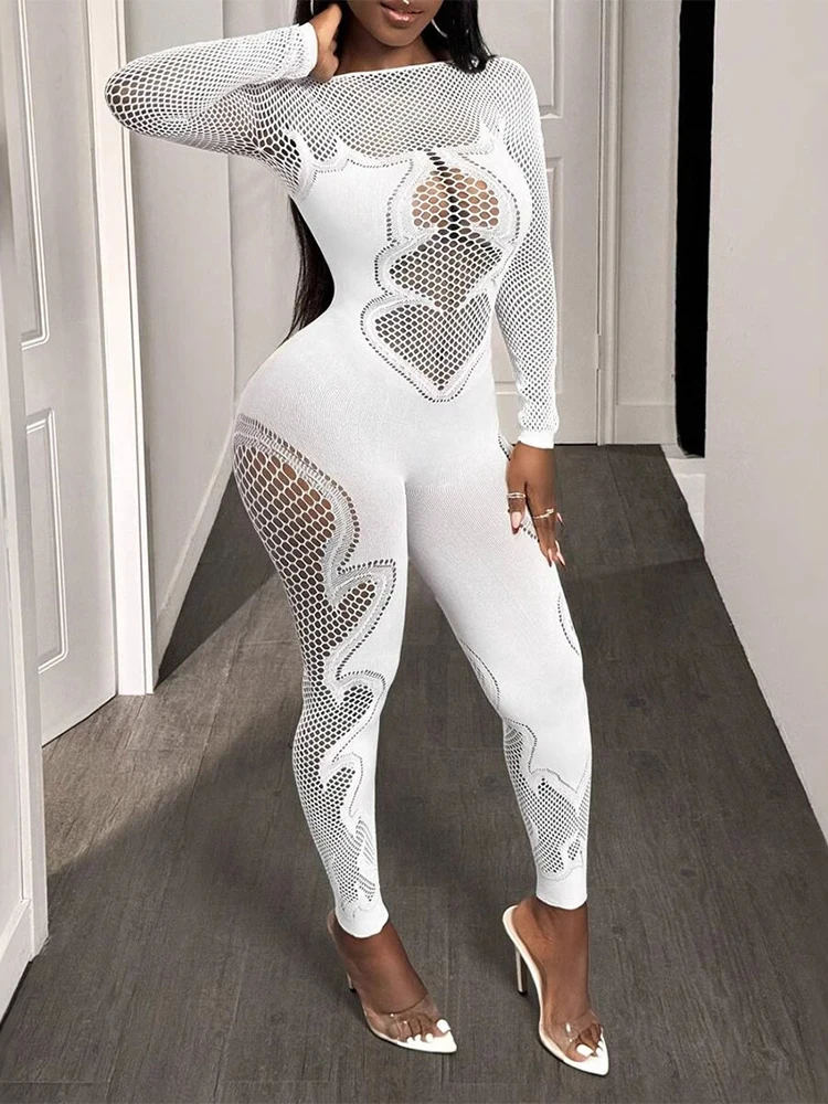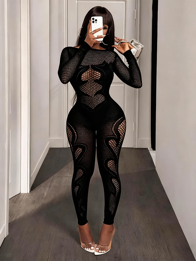 FHSEER Macacão feminino sexy malha transparente manga comprida oco bodycon cintura alta elástico clube festa data noite fora roupa - TopDealBox