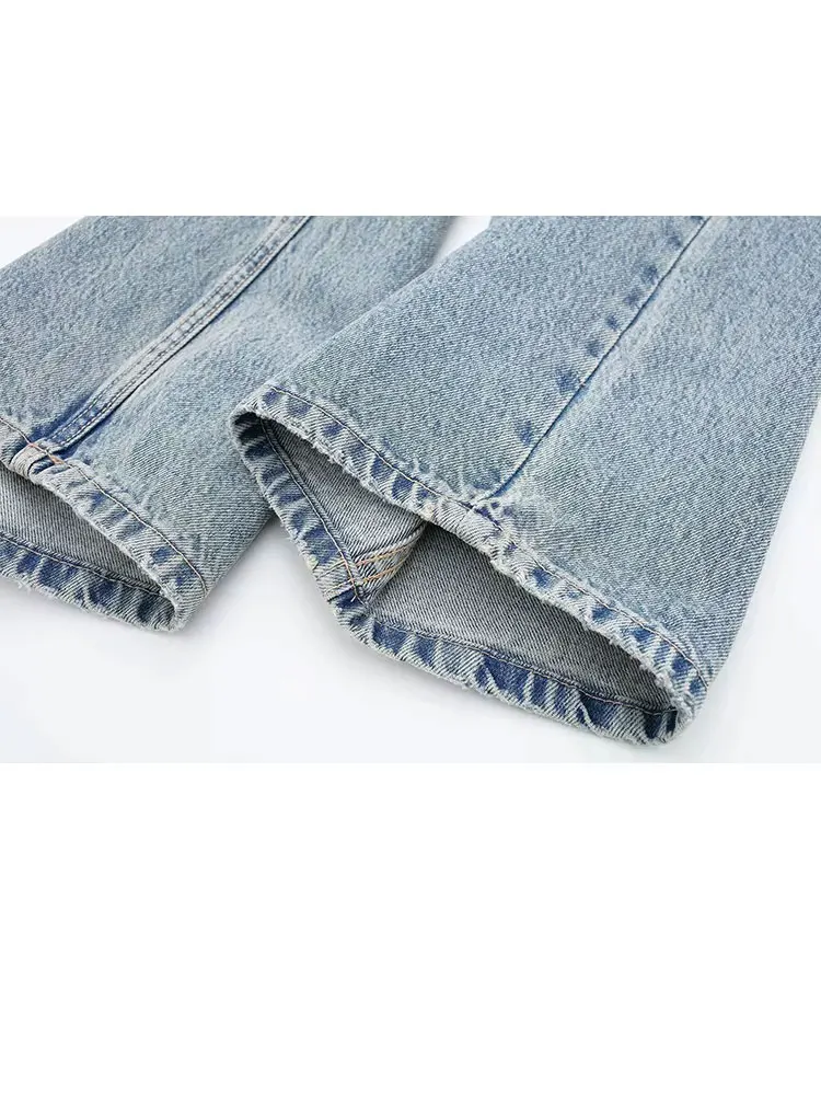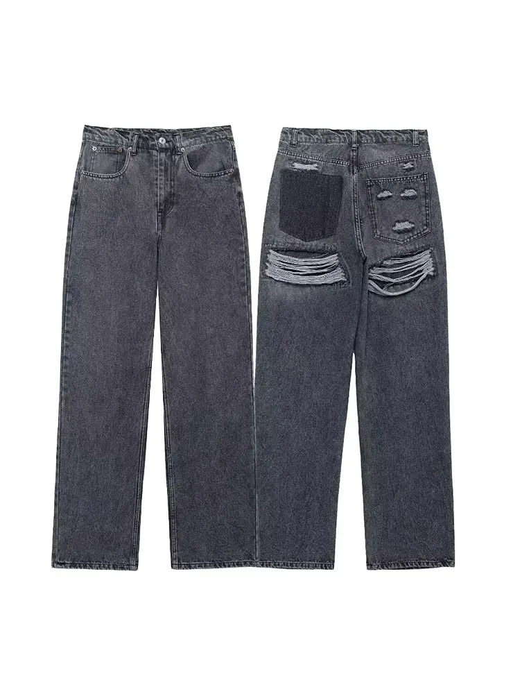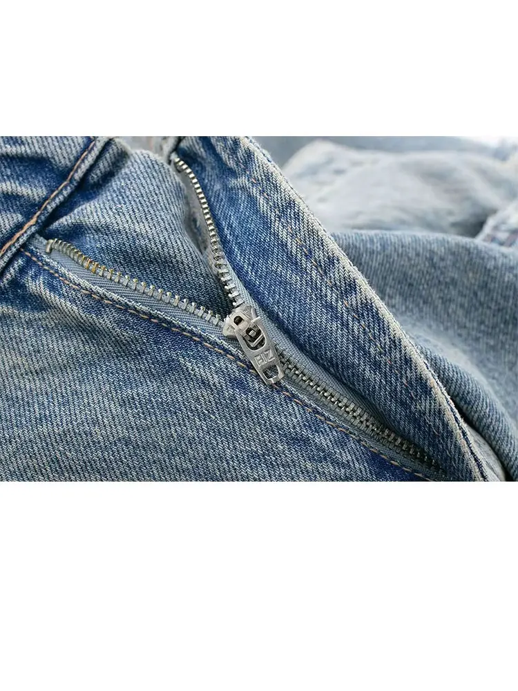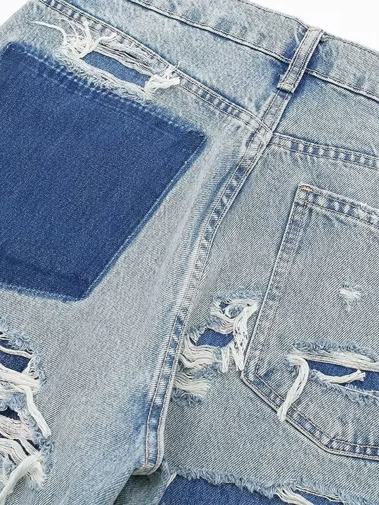 Hh 2024 moda de rua feminina denim azul jeans angustiado retalhos cintura alta zíper voar rasgado retro calças compridas - TopDealBox