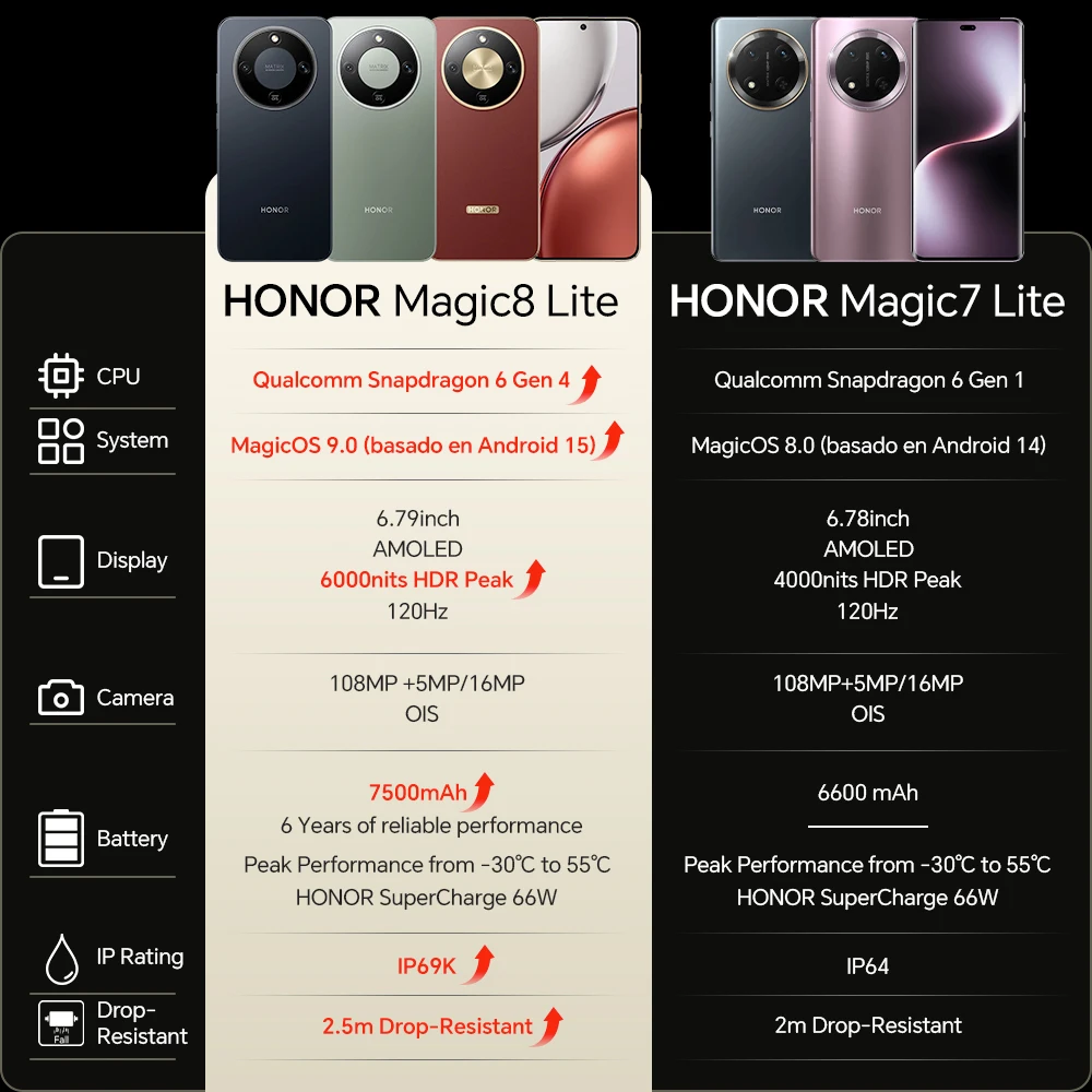 HONOR Magic 8 Lite Versão EU Smartphone 5G Snapdragon 6 Gen4 Resistente a Quedas de 2,5m IP69K Resistente a Poeira 7500mAh 108MP OIS AI eSIM - TopDealBox
