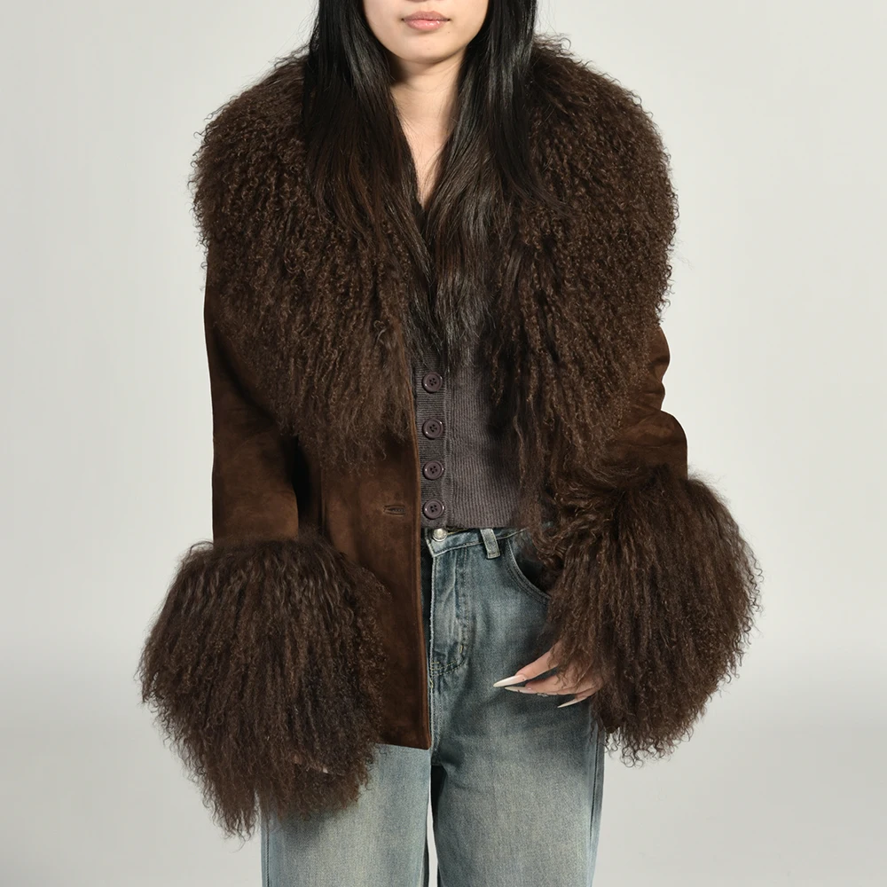 Início > Roupas femininas > Couro legítimo Jaxmonoy jaqueta feminina de couro de camurça real com pele de ovelha mongol real 2025 outono inverno novo design casacos de camurça genuína feminino Informações de envio