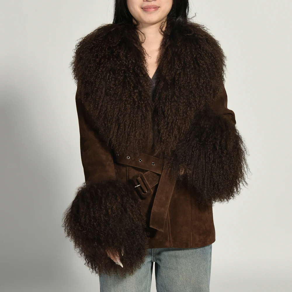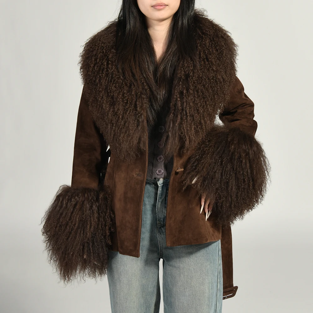 Jaxmonoy jaqueta feminina de couro de camurça real com pele de ovelha mongol real 2025 outono inverno novo design casacos de camurça genuína feminino - TopDealBox Visualização rápida