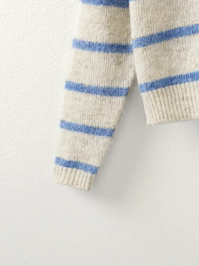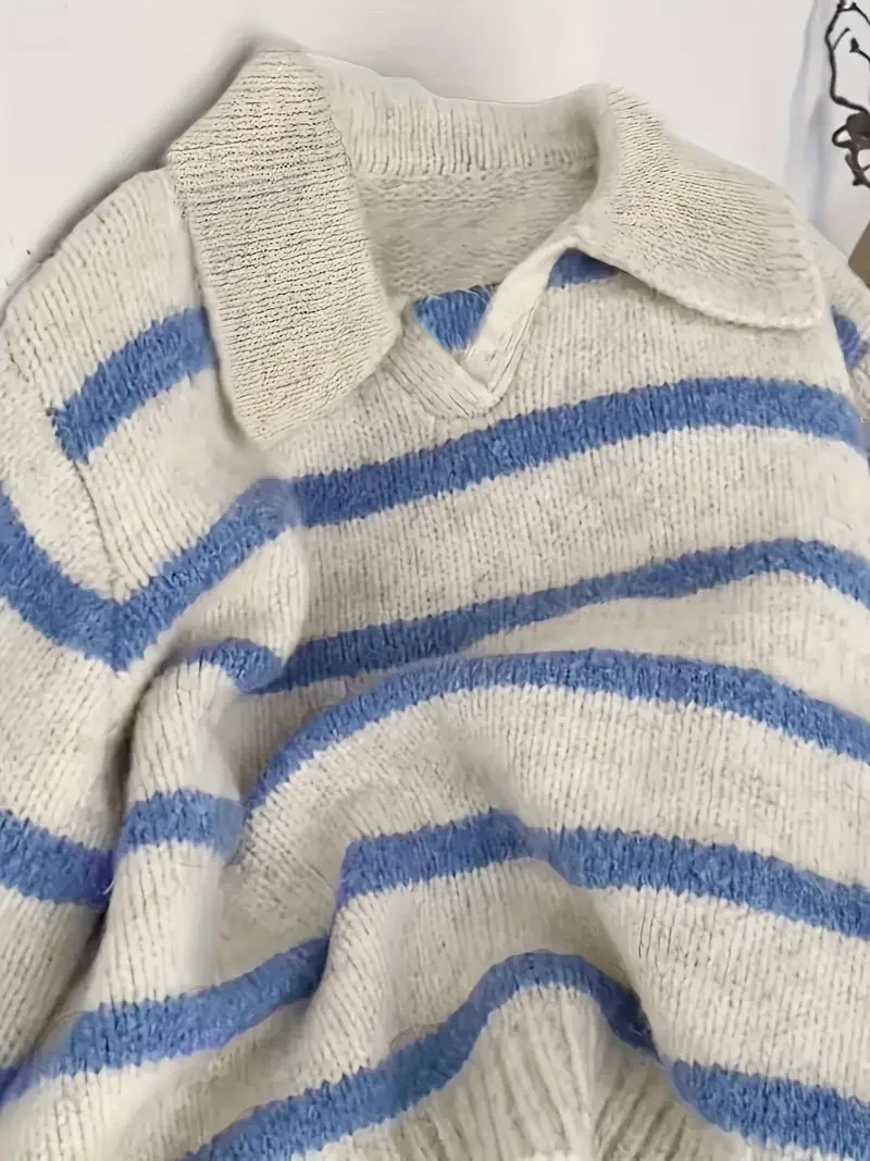 Moda feminina casual gola polo listrada com capuz de malha macia e confortável suéter intercambiável - TopDealBox