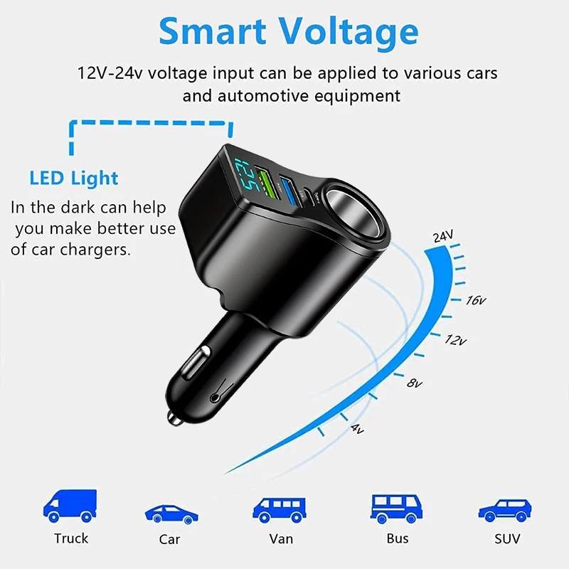 Novo Carregador de Carro Digital com Display, Carregamento Rápido, Carregador de Carro Dual USB, Adaptador de Carro de 66W Multifuncional - TopDealBox