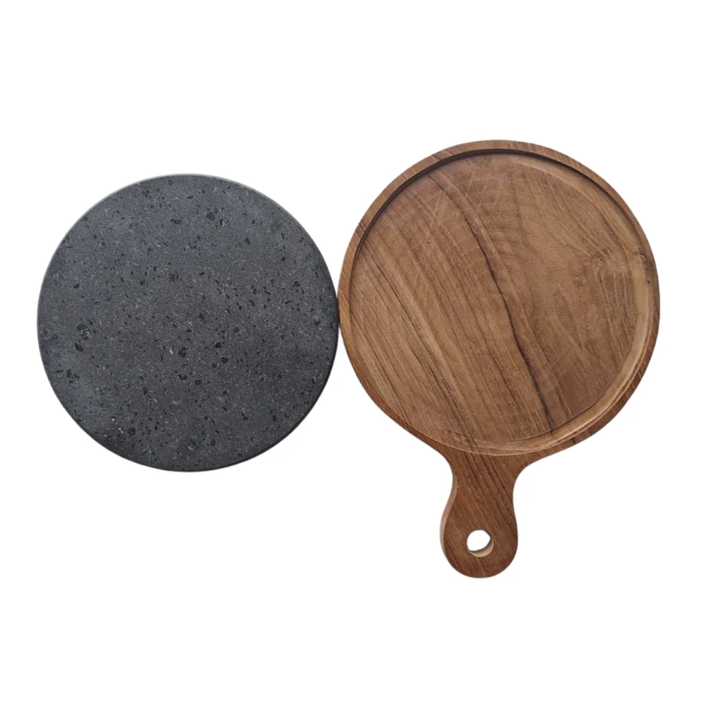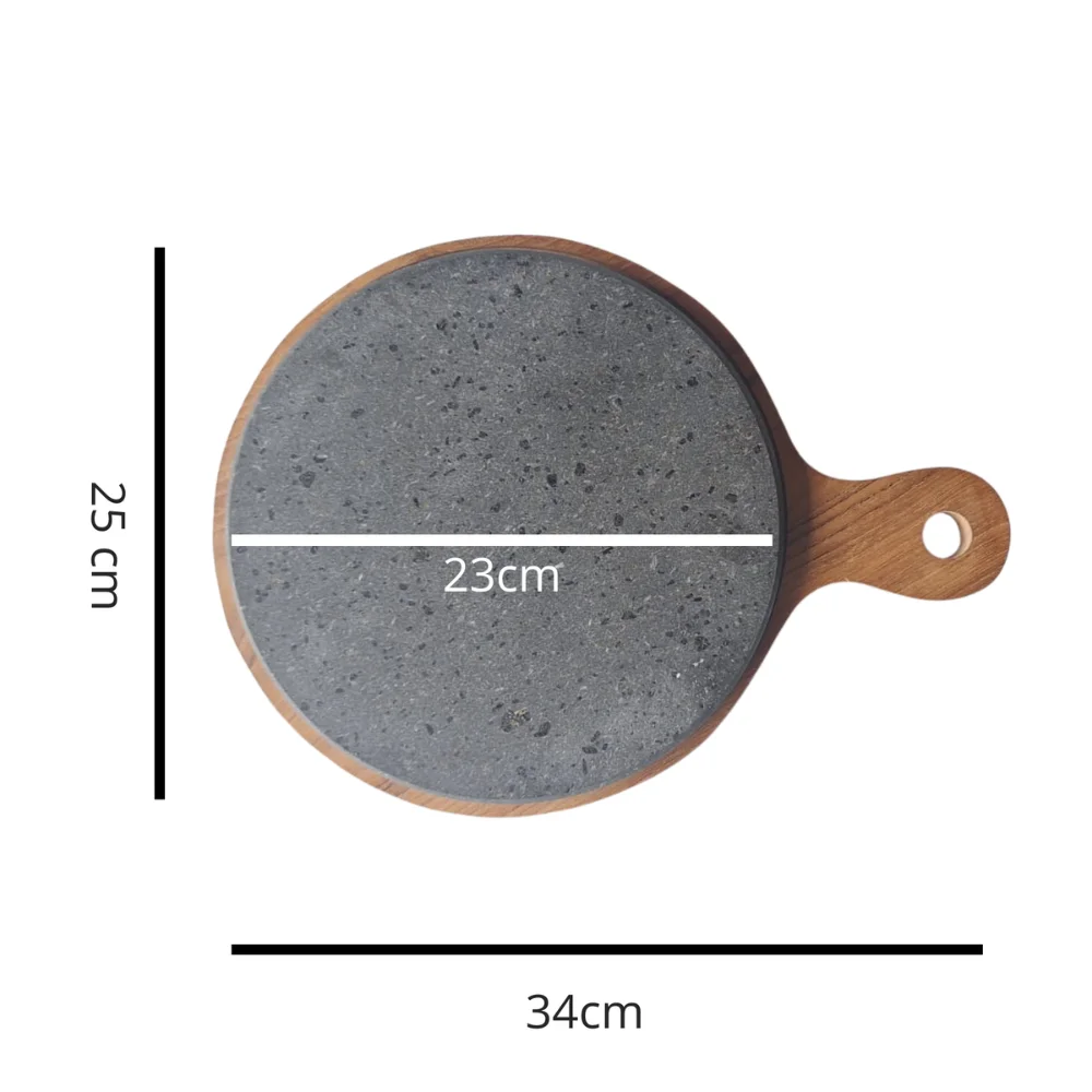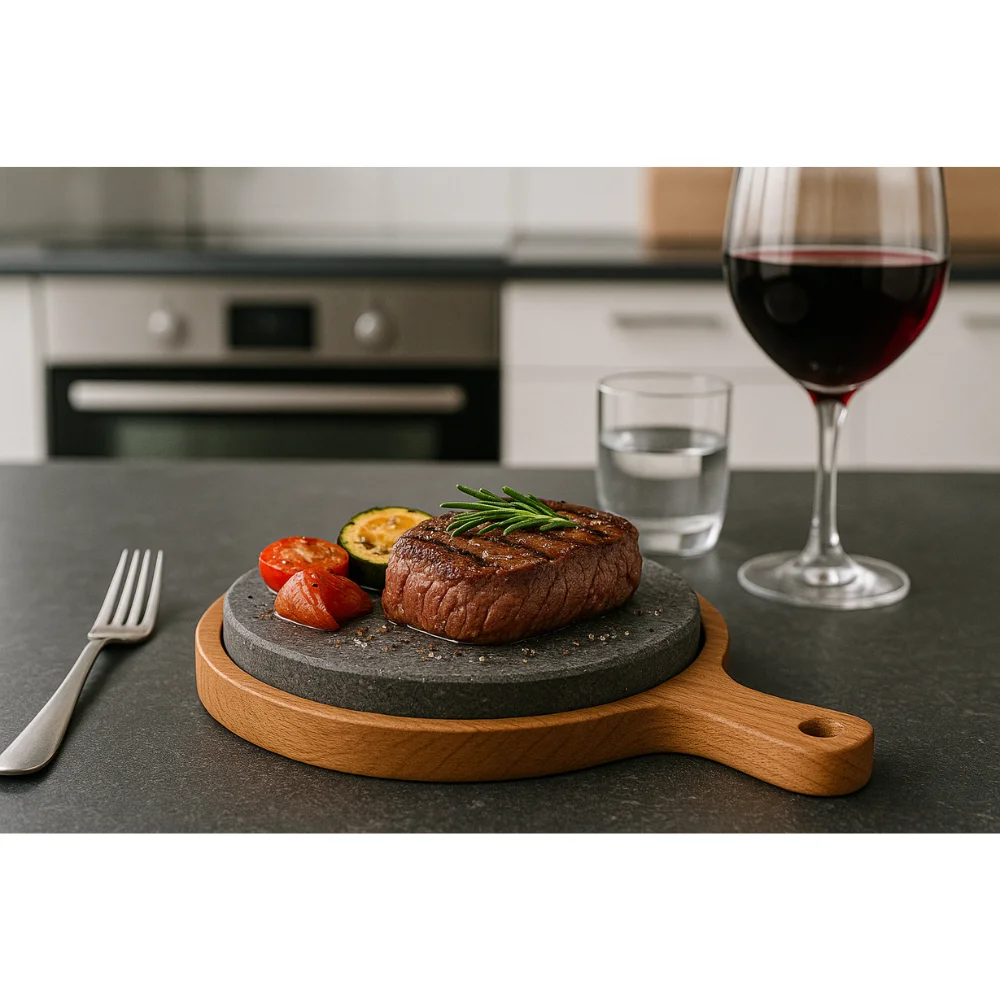 Prato redondo de pedra de lava natural com base de madeira - Ø 23 cm - Efeito de pedra quente - Carne, peixe e legumes quentes - Fabricado na Itália | Criações Kalu - TopDealBox
