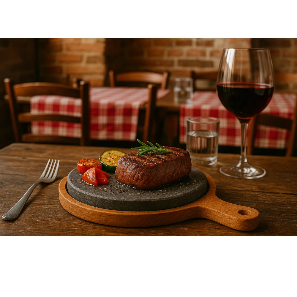 Início > Melhorias domésticas > Pedras e lajes Prato redondo de pedra de lava natural com base de madeira - Ø 23 cm - Efeito de pedra quente - Carne, peixe e legumes quentes - Fabricado na Itália | Criações Kalu Informações de envio