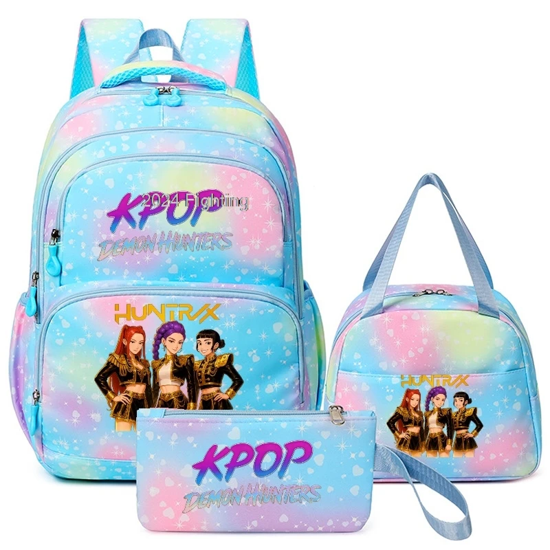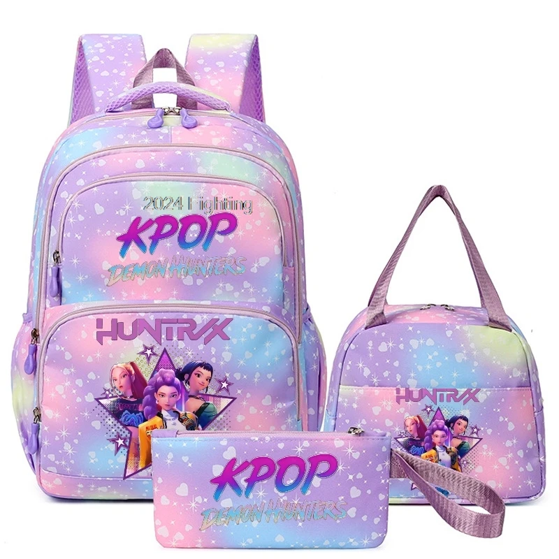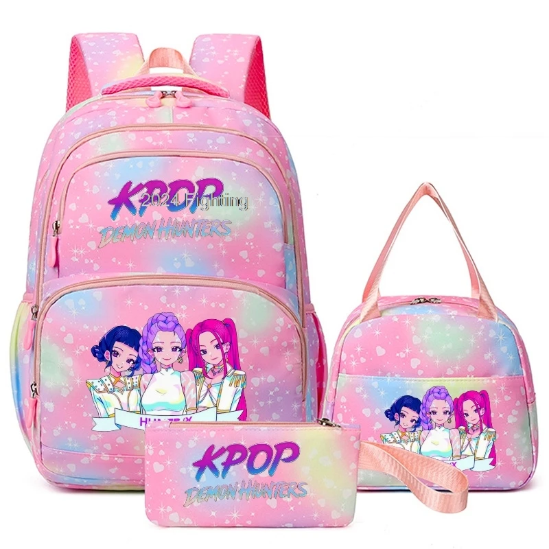Mochila KPop Demon Hunters com 3 Peças e Bolsas para Almoço Rumi Mira Zoey HUNTR/X Saja Boys Mochilas Escolares Coloridas com Múltiplos Bolsos - TopDealBox